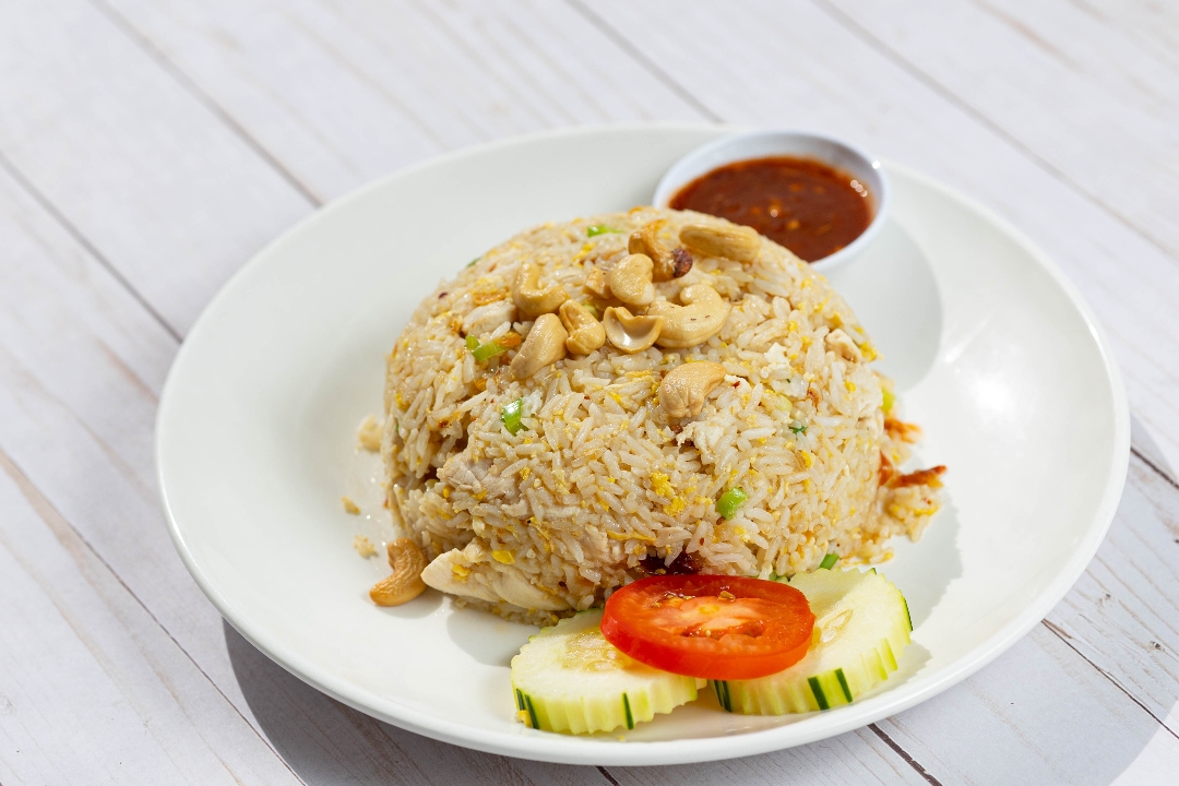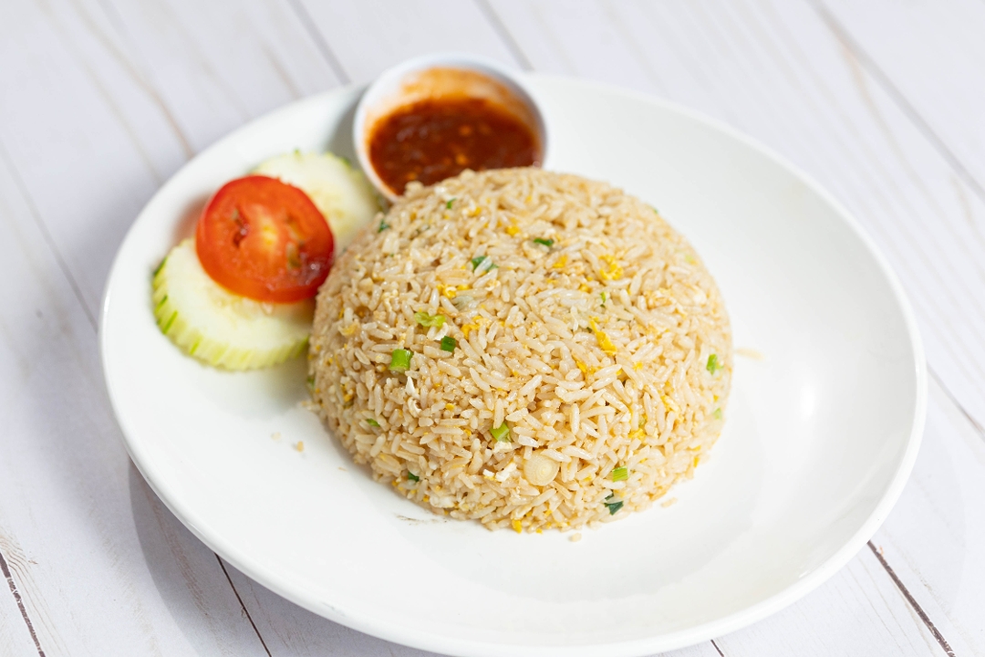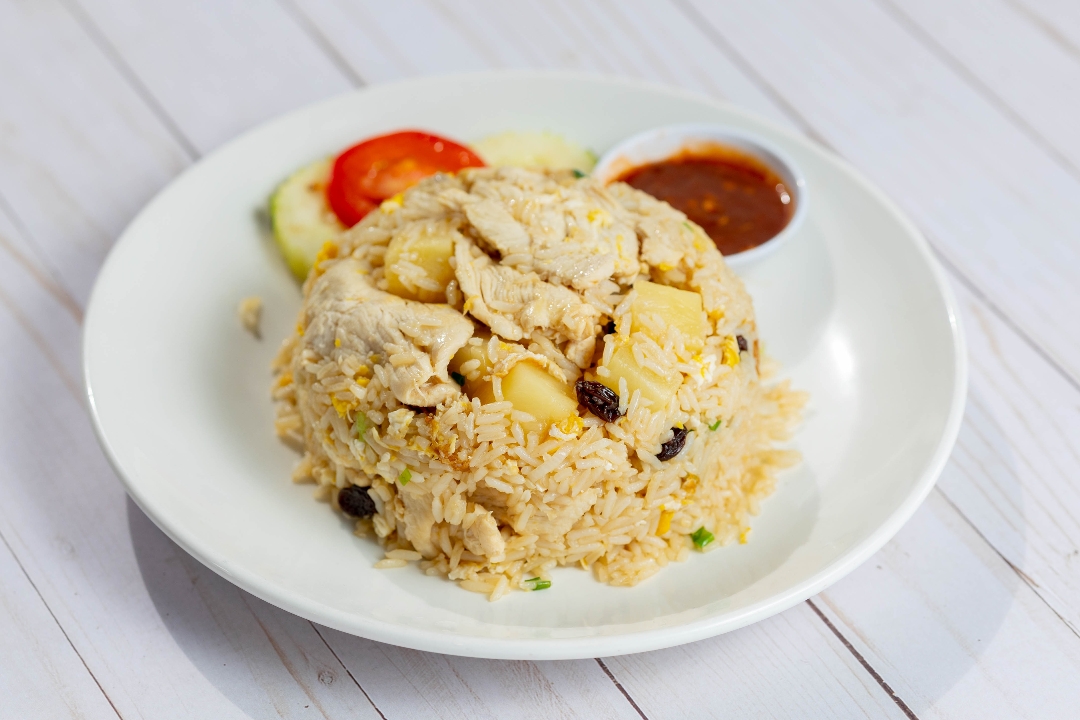 Fried rice with a choice of protein, pineapple, raisins, green onion, and egg