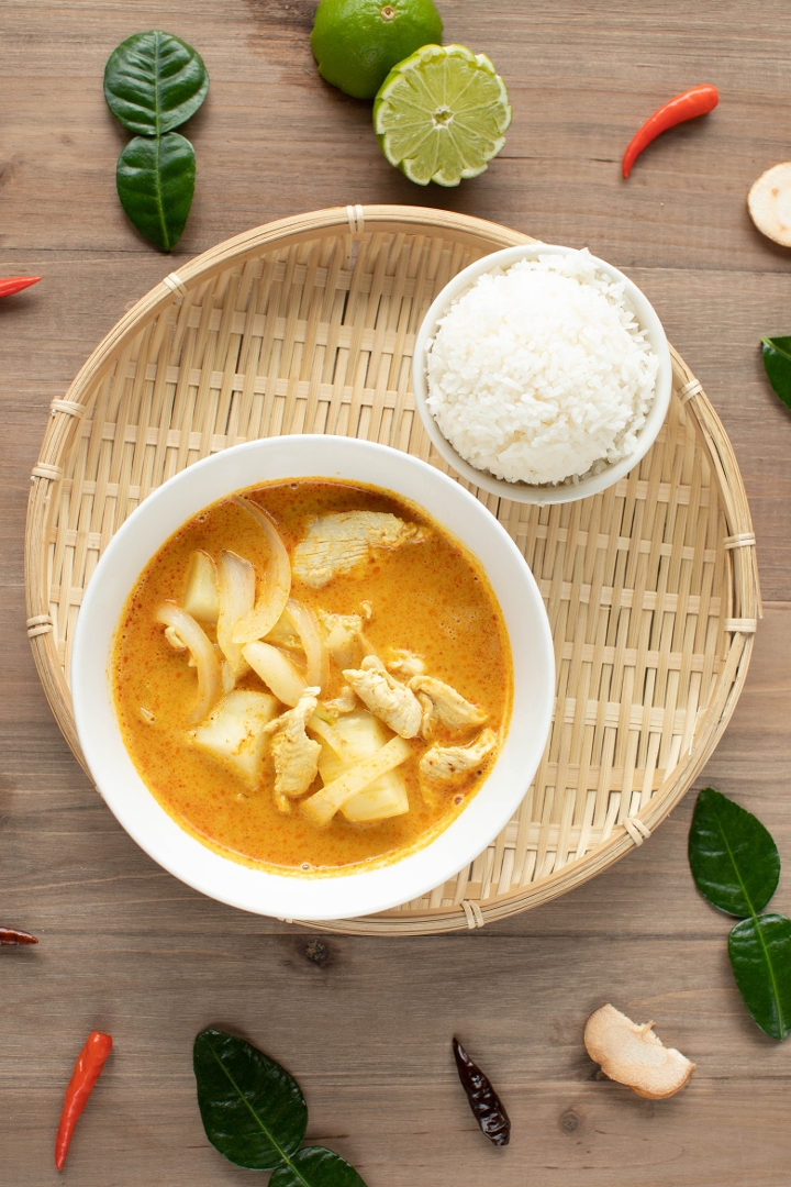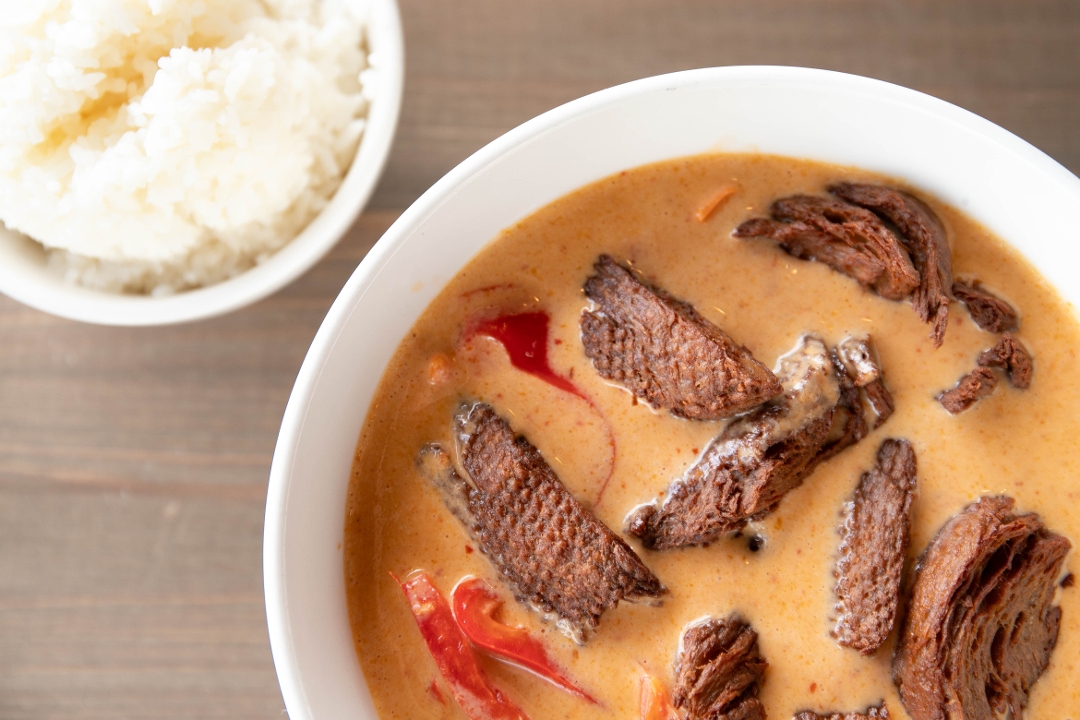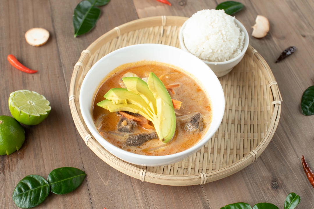 Savory beef cubes simmered in coconut milk, massaman curry paste, onions, peanuts, carrots, and potatos with sliced avocado