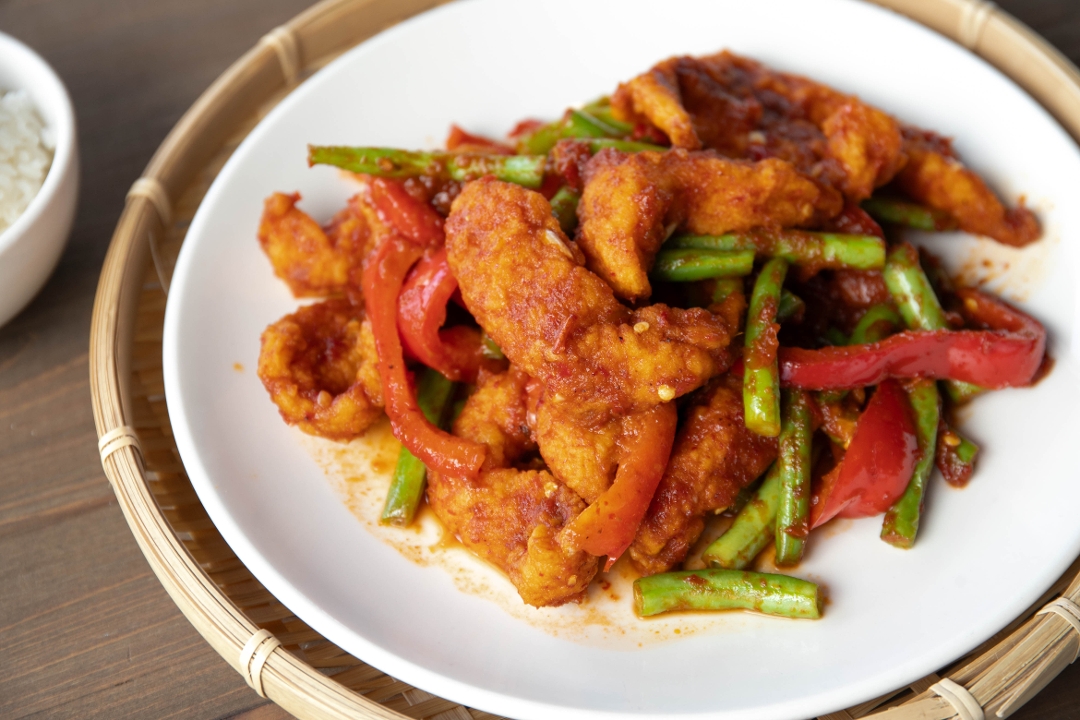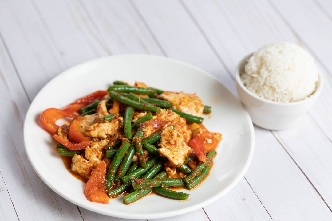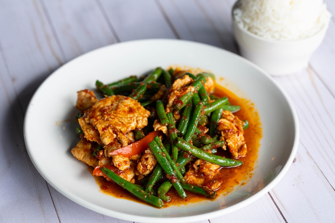 Protein stir-fried in a spicy and herbal prik khing curry paste, green beans, and bell peppers