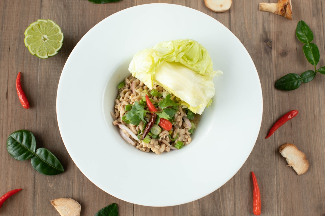 Spicy minced chicken, onions, cilantro, and roasted rice powder seasoned with spicy lime dressing with a side of lettuce