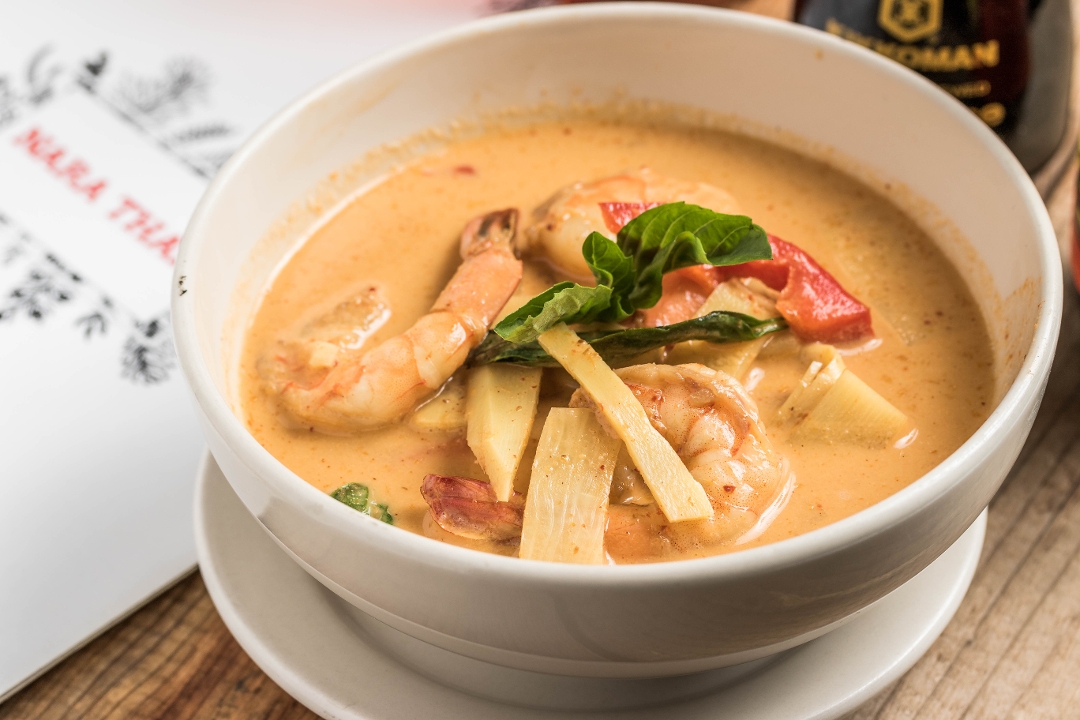 Protein simmered in 16oz of a bold and spicy coconut milk curry with bamboo shoots, bell peppers, and basil