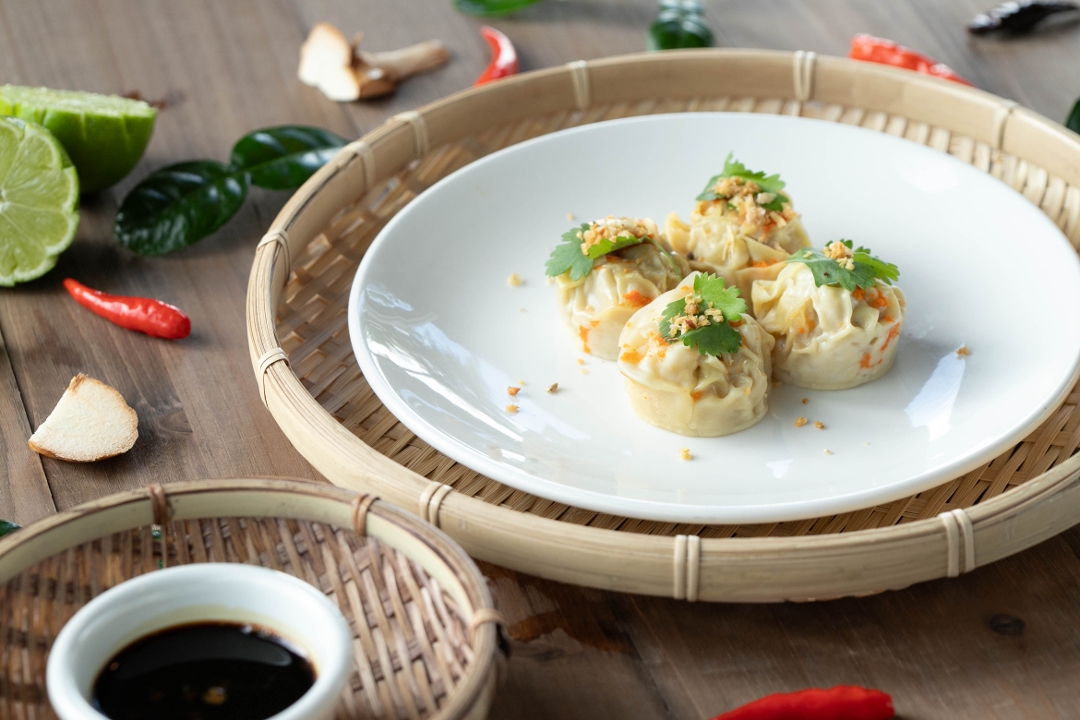 4 seasoned chicken, shrimp, mushrooms, and water chestnuts ground up in a dumpling wrapper, served with soy vinegar sauce