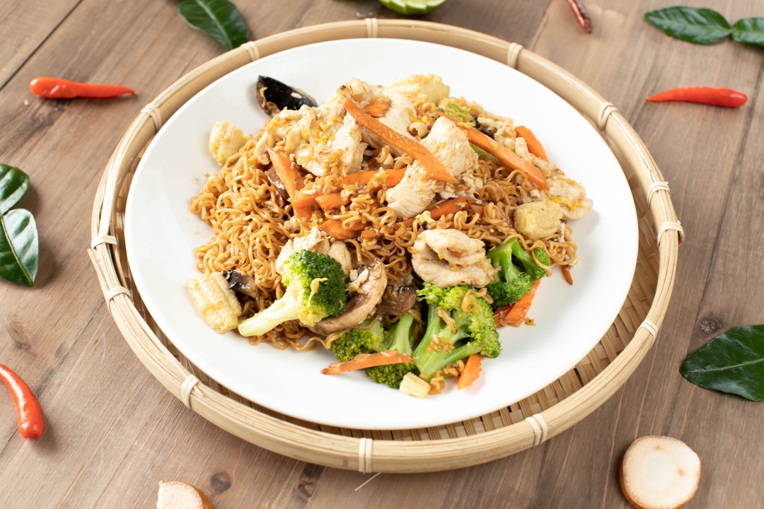 Protein stir-fried with egg noodles, eggs, baby corn, broccoli, carrots, and mushrooms in house brown sauce