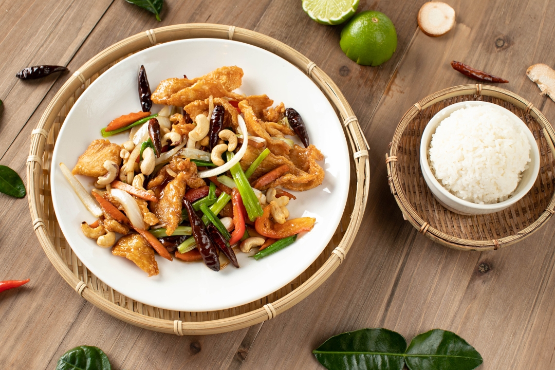 Breaded protein stir-fried with onions, carrots, bell peppers, dried chili, and cashew nuts in house brown sauce