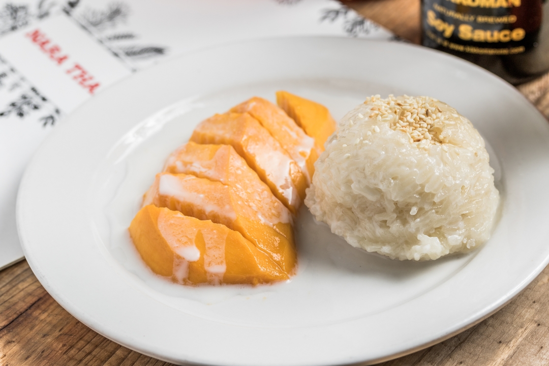 fresh mango slices over sticky rice smothered in sweet coconut milk topped with sesame seeds