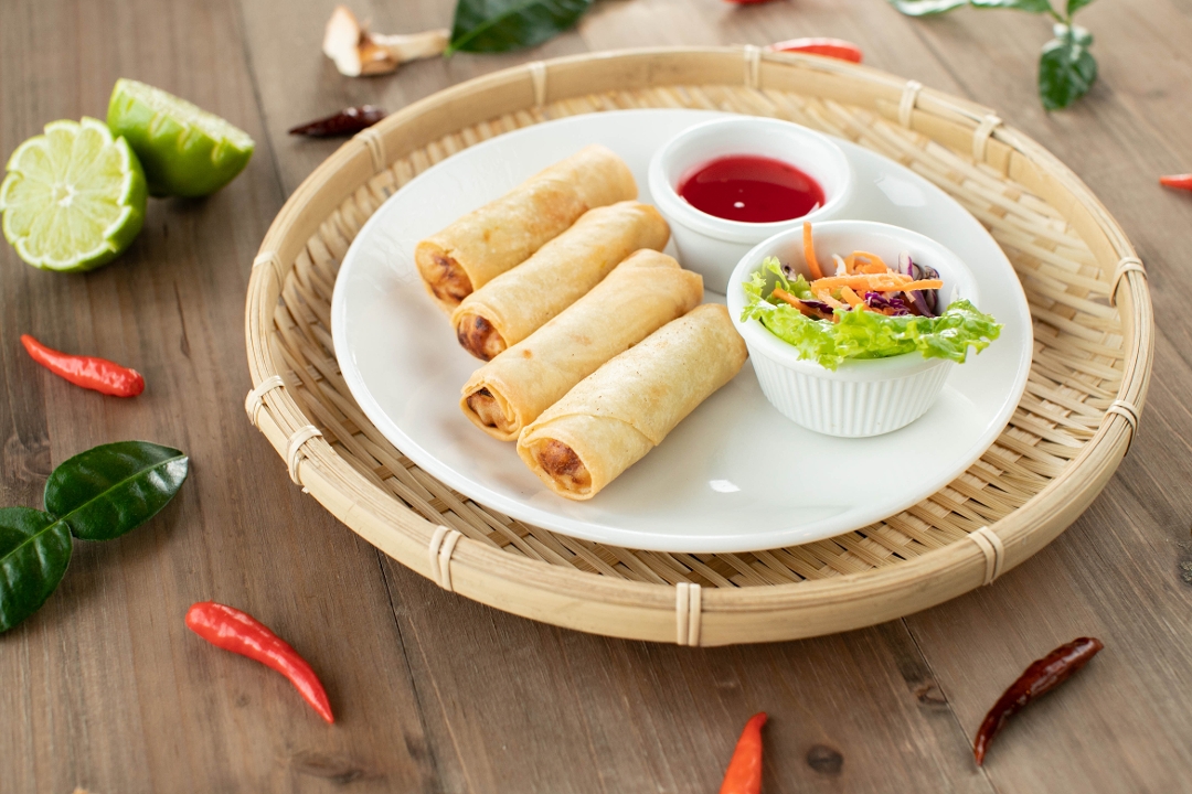 4 fried rolls with cabbage, carrot, and vermicelli noodles with spring roll sauce