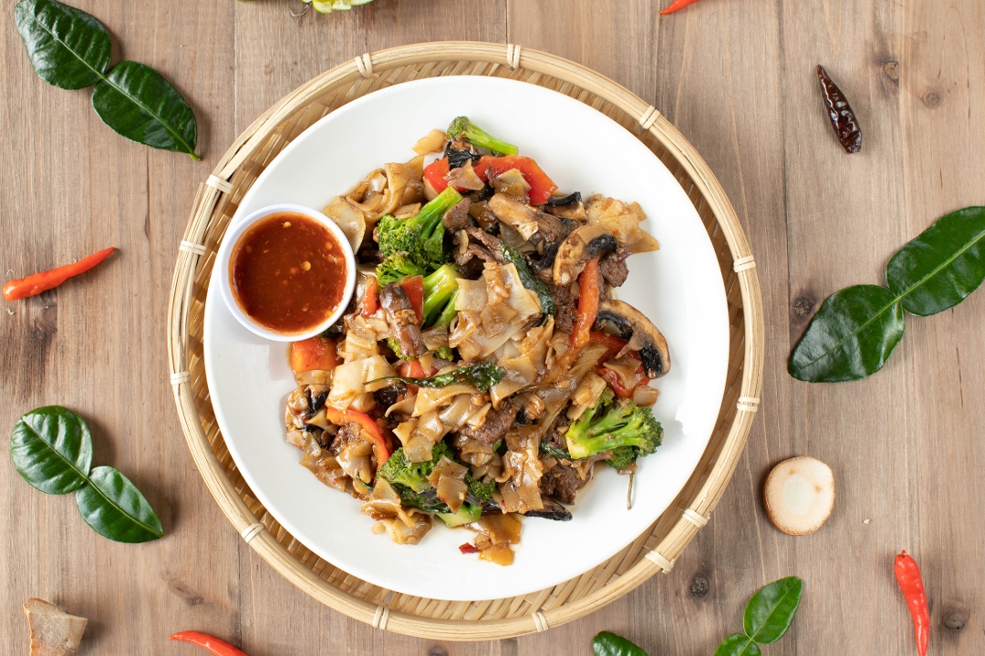 Protein stir-fried with flat rice noodles, mushrooms, bell peppers, broccoli, tomatoes, and basil in house brown sauce