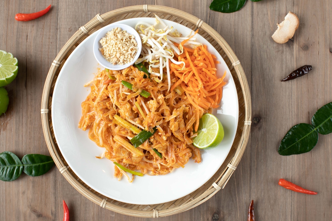 Protein stir-fried with rice noodles, eggs, bean sprouts, & green onion in tamarind sauce with crushed peanuts on the side
