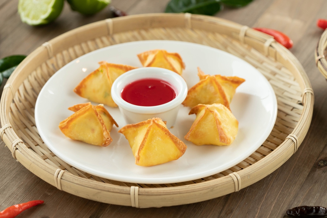 6 fried wontons stuffed with cream cheese, scallion, and crab with spring roll sauce