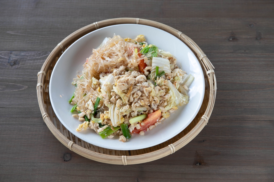 Protein stir-fried with glass noodles, eggs, napa cabbage, tomatoes, and green onions in our house brown sauce
