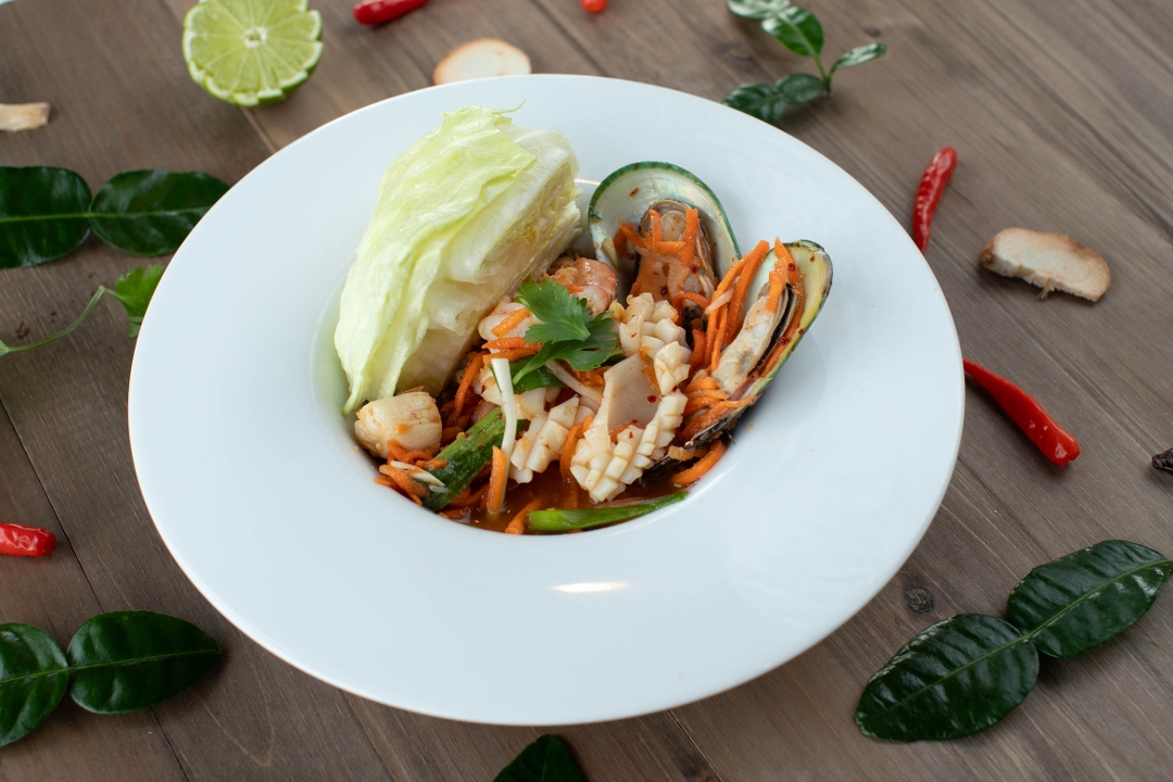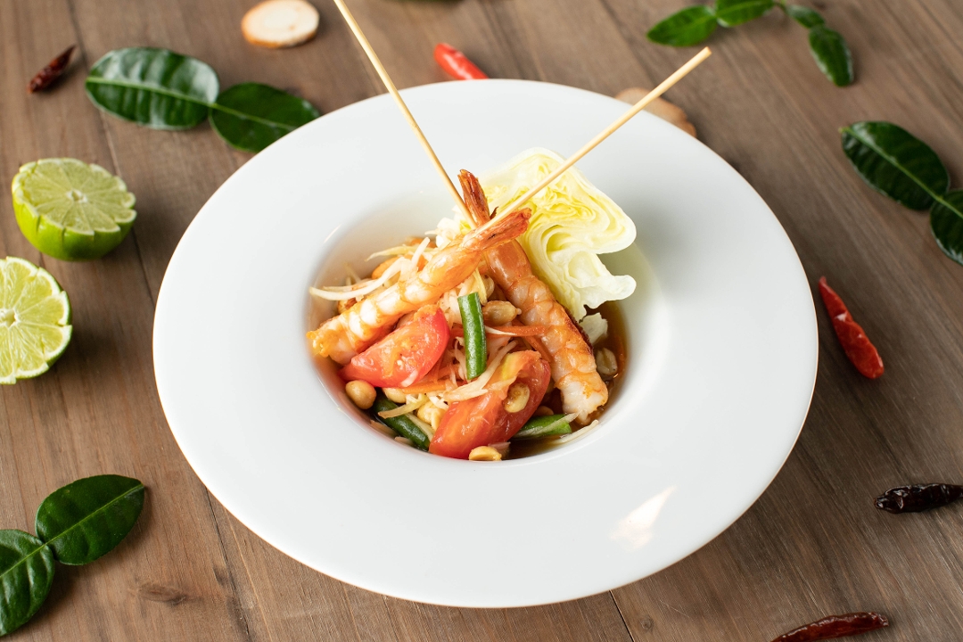 Shredded green papaya, carrots, grilled shrimp, tomatoes, and peanuts on lettuce seasoned with spicy lime dressing