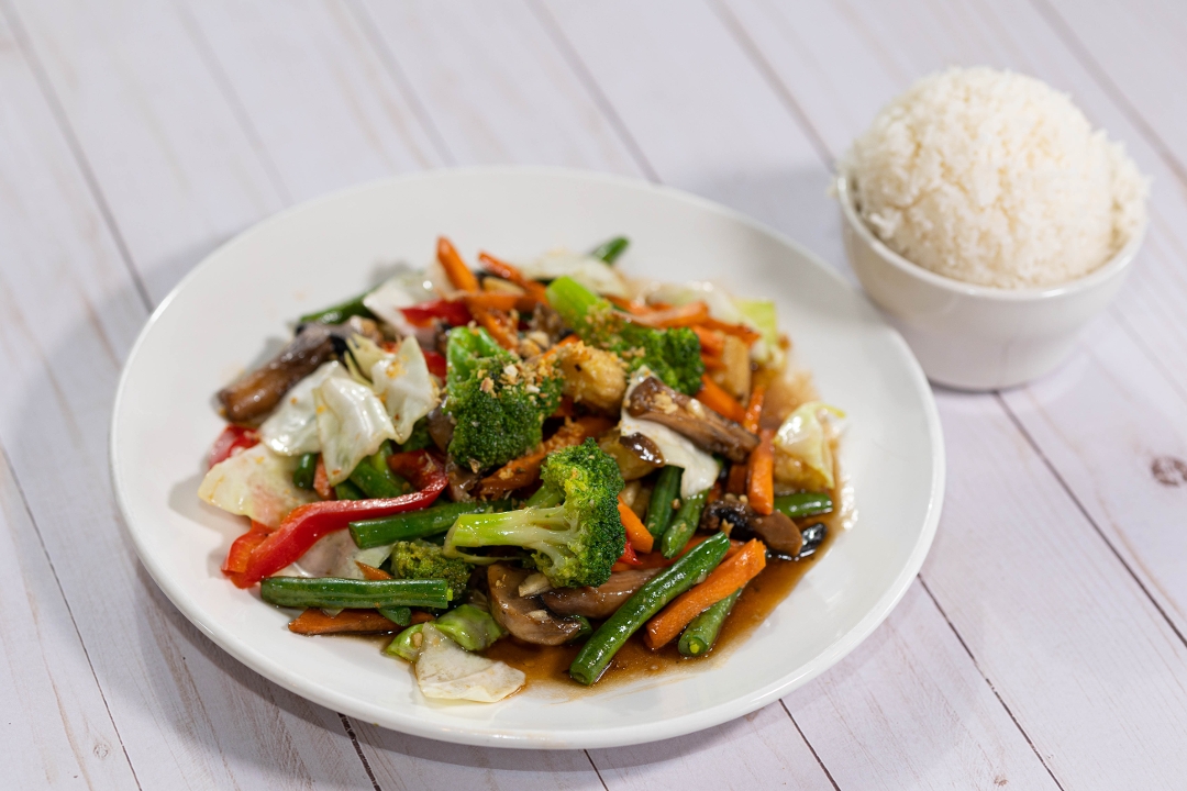 Deep-fried breaded choice of protein cooked in house orange sauce, sesame seeds and steamed veggies.