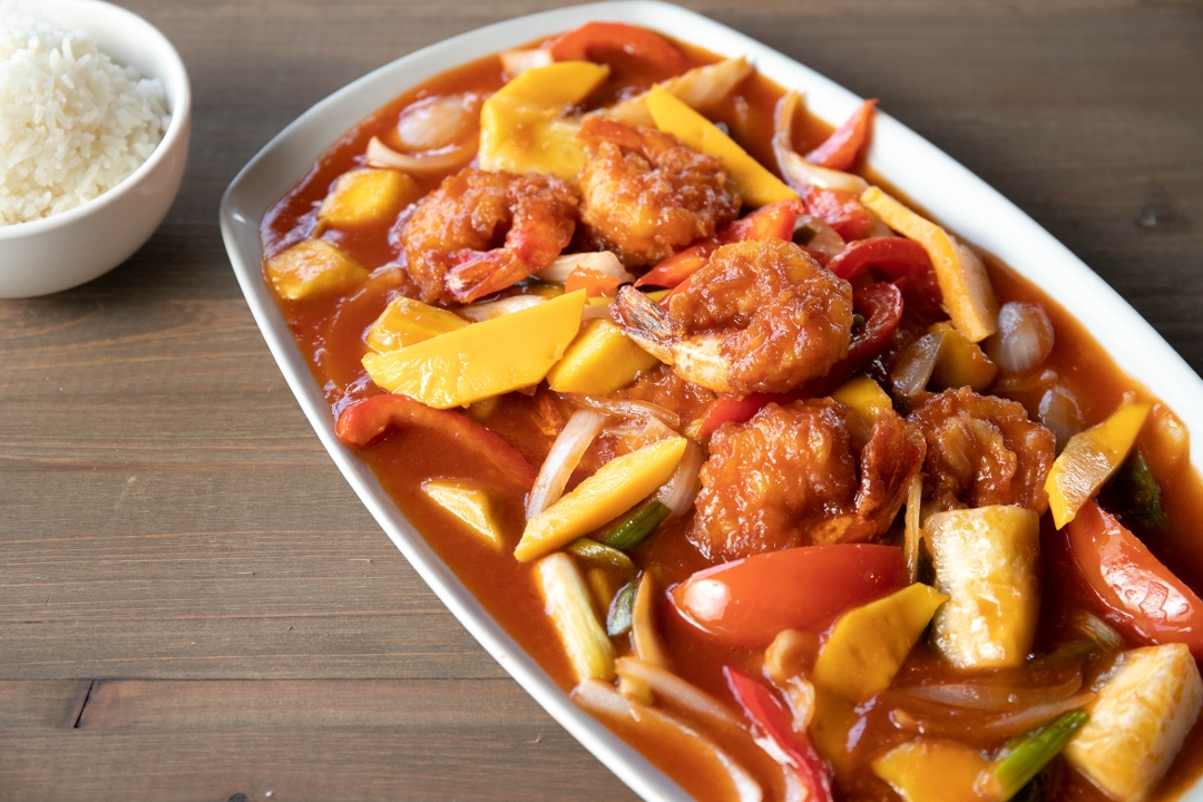 Deep-fried breaded shrimp stir-fried in a sweet & sour mango and tomato sauce with bell pepper, onions and cucumber