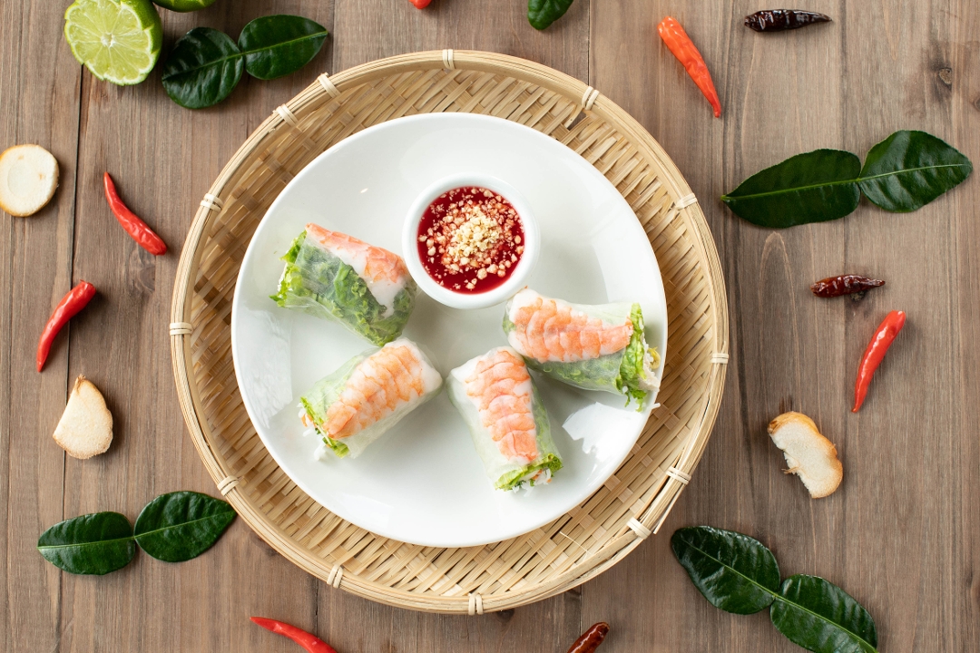 2 rolls with chicken, shrimp, lettuce, vermicelli noodles, cilantro, carrots, and cucumbers wrapped in clear rice paper with spicy peanut sauce or a spring roll sauce