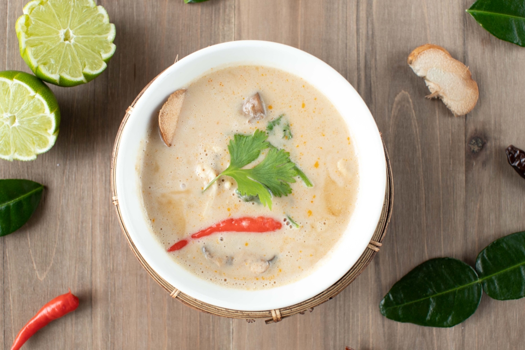 Coconut milk, galangal, mushrooms, kaffir lime leaves, and lime juice