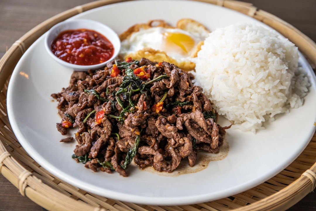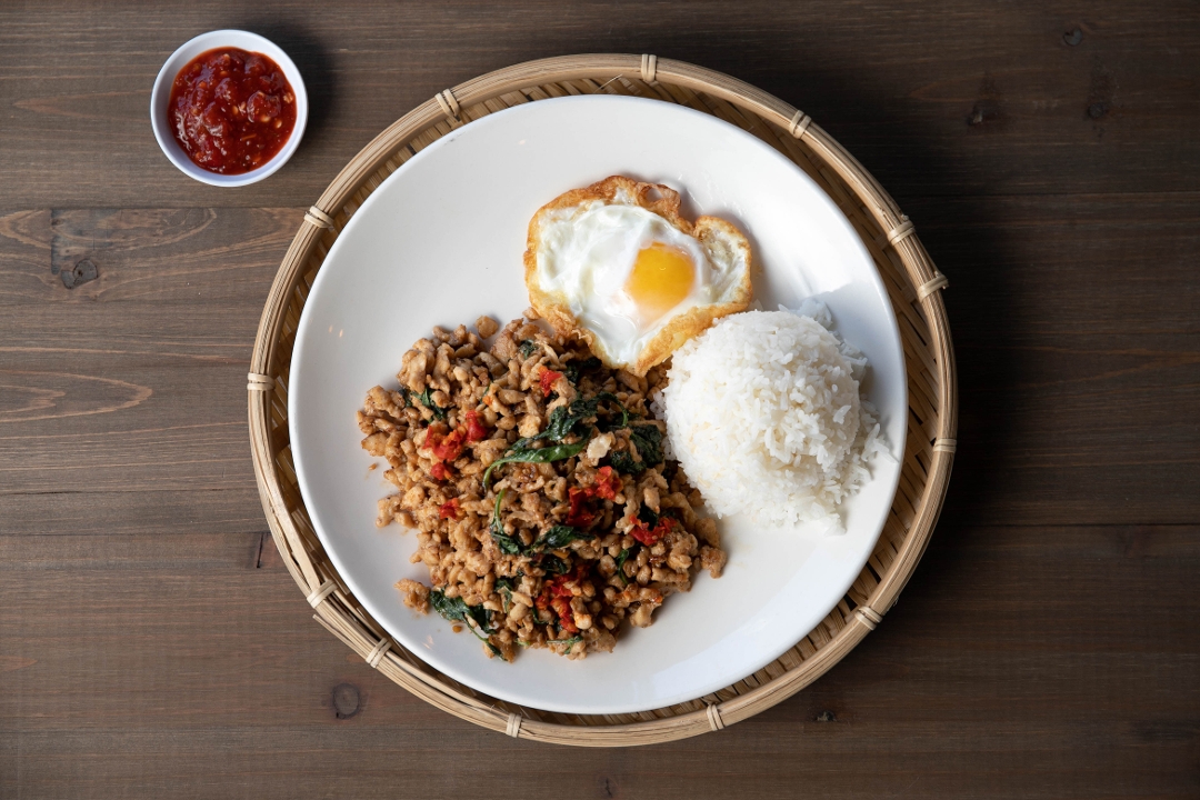 Minced beef stir-fried with fresh garlic, thai chili, basil and a fried egg