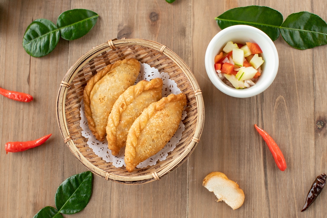 3 fried pastries filled with chicken, potato, and carrot served with cucumber relish
