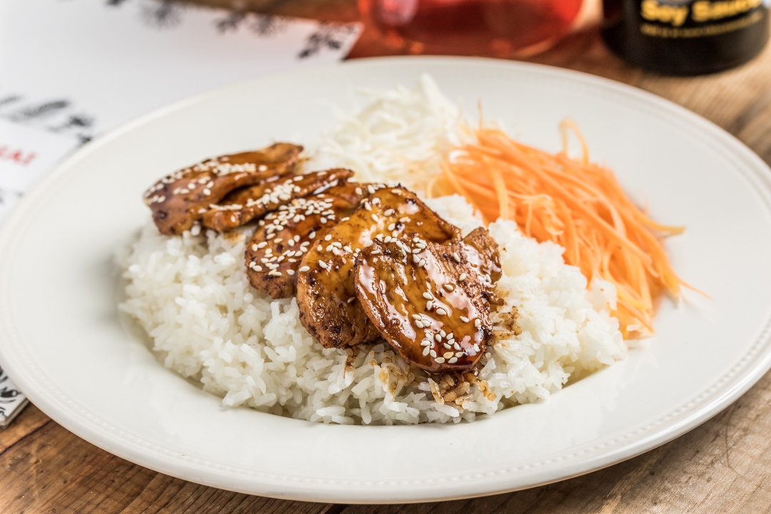 Grilled protein topped with teriyaki sauce on a bed of rice with toasted sesame seeds, preserved cabbage, and carrot on the side