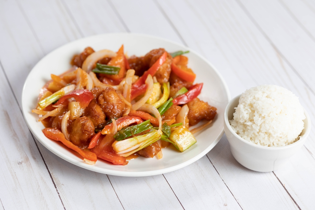 Deep fried breaded chicken or a protein of your choice, bell pepper, onion, green onion, tomato, pineapple, and cucumber cooked in pineapple and tomato sauce
