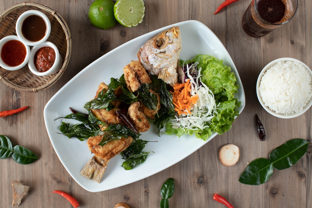 Crispy catfish fillet, prik khing curry paste, bell peppers, and green beans