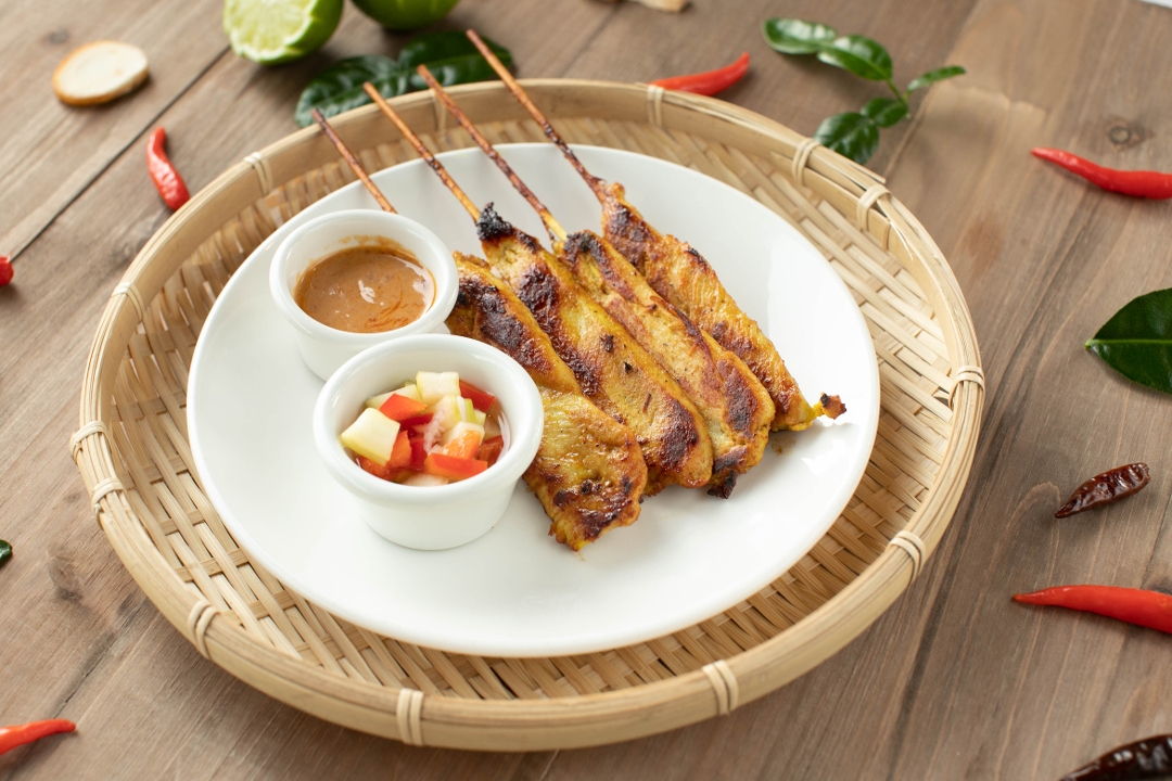 4 sticks of chicken breast, grilled and served with peanut sauce dip & cucumber relish