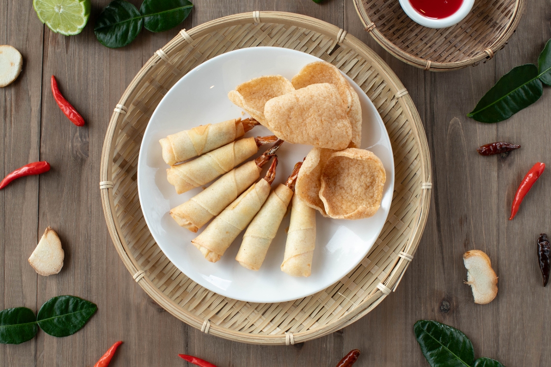 6 Shrimp with ginger deep-fried in spring roll wrap served with spring roll sauce