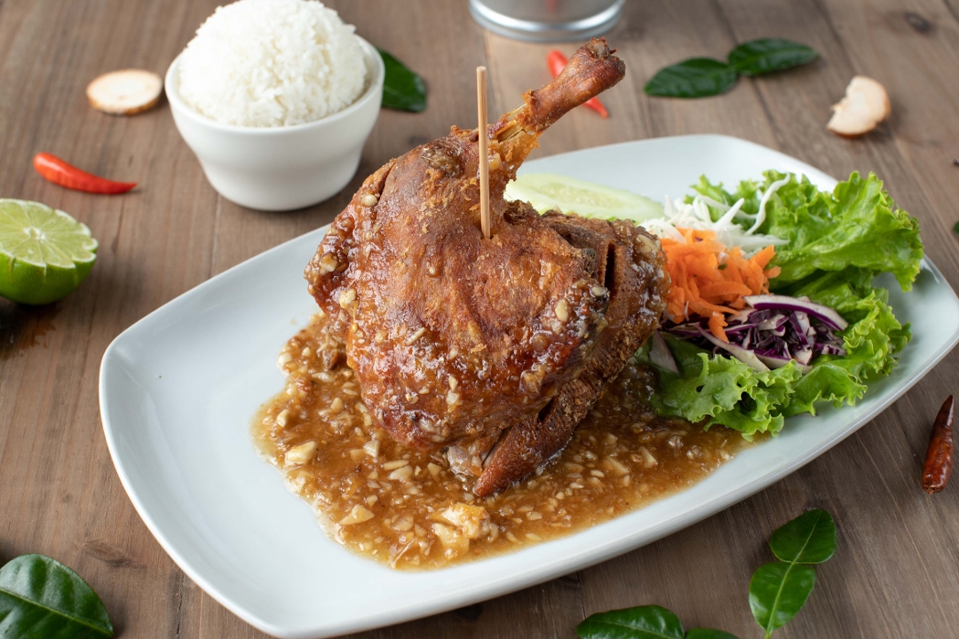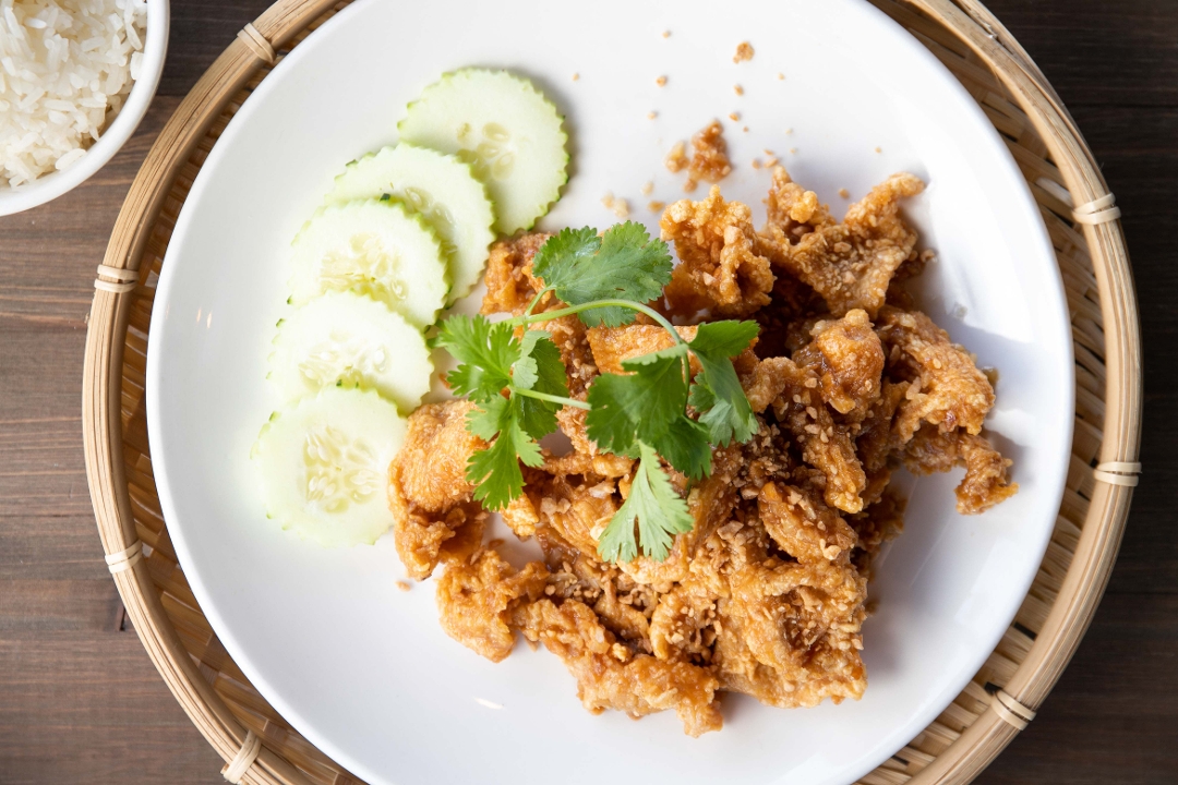 Fried chicken or protein of choice stir-fried with garlic in our house brown sauce served with cucumbers relish and topped with cilantro.