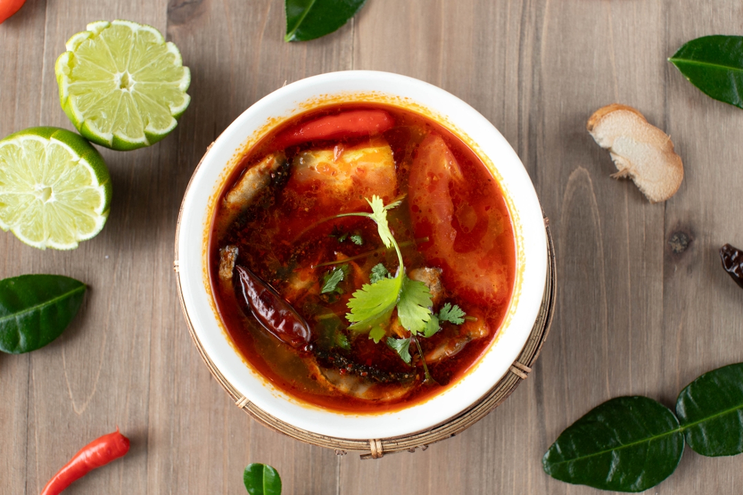 Spicy lemongrass soup with tomatoes, mushrooms, cilantro, and lime juice