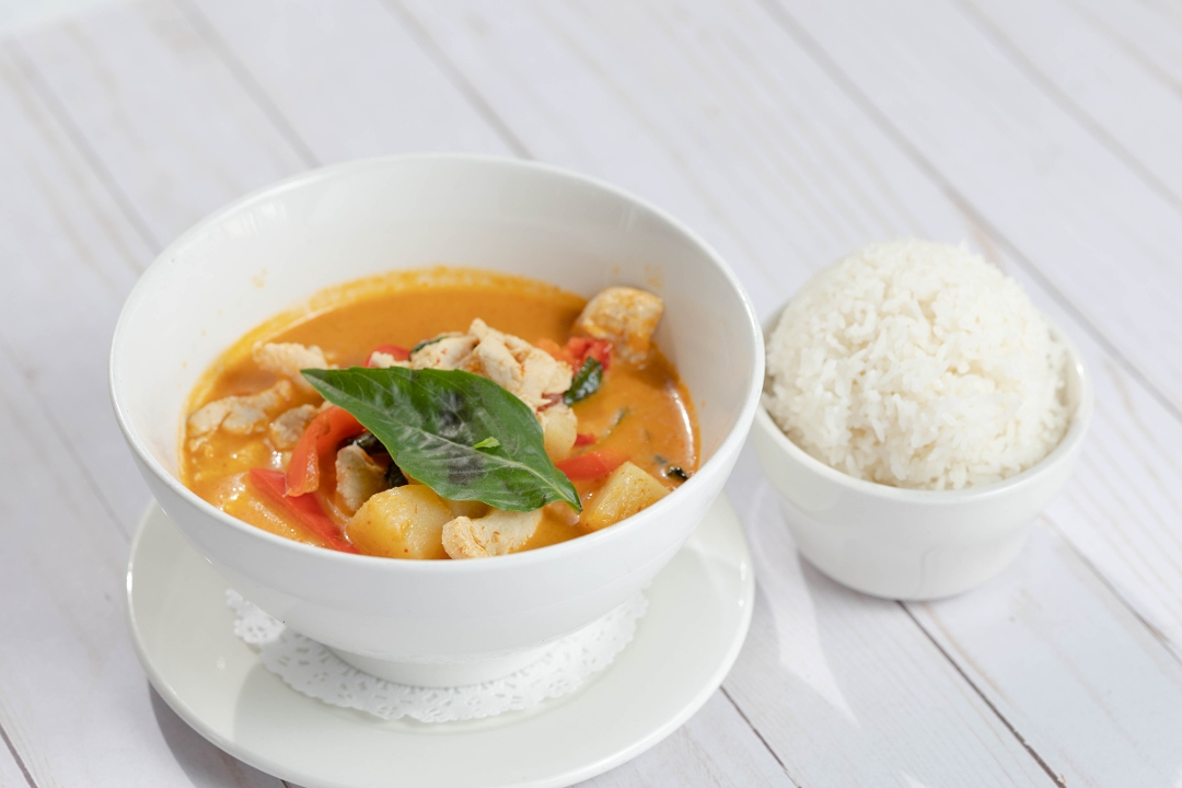 Protein simmered in 16oz of a bold, sweet and spicy coconut milk curry with bell pepper, pineapple, and basil