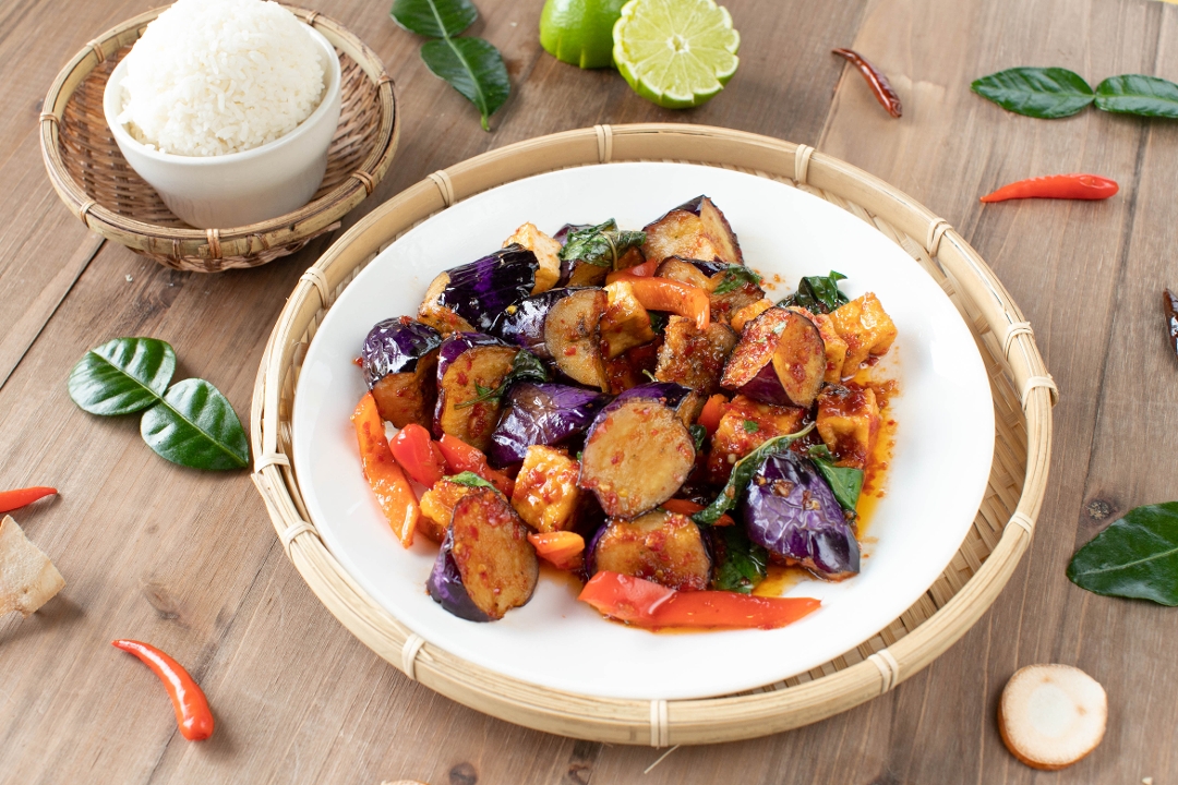 Tofu or your choice of protein, purple eggplant, garlic, basil and bell pepper sautéed in house brown sauce