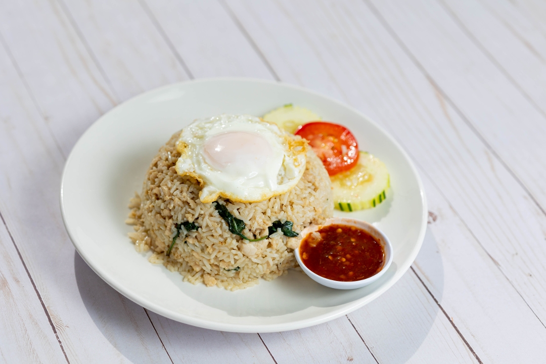 Protein stir-fried with rice with house brown sauce punched up with sweet basil, garlic, chilli, and topped with a fried egg. Best eaten as spicy as you can handle.