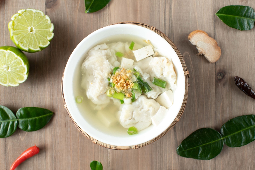 Chicken and shrimp wontons in chicken soup with bean sprouts and green onions.