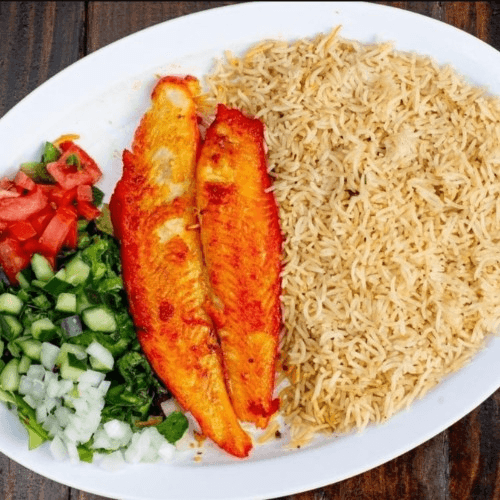 Marinated Fish over basmati rice with shredded lettuce, spring mix salad, diced tomato, cucumber, onion, side pita bread and sauces.