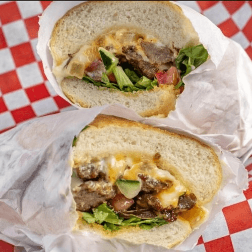 Thinly shaved steak, grilled onion, white cheese, yellow cheese, grilled onion, Queen sauce, garlic sauce over 6-inch hoagie rolls.