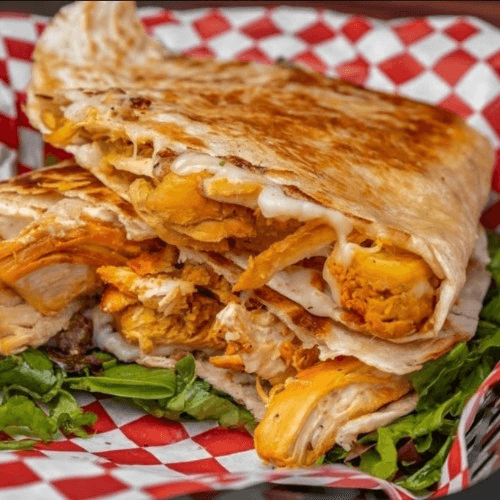 Marinated chicken, mozzarella cheese, wrapped in white tortilla, served with garlic sauce, Queen sauce and hot sauce.