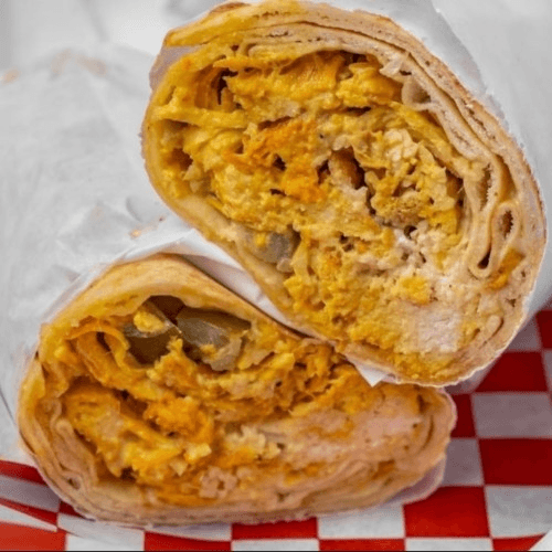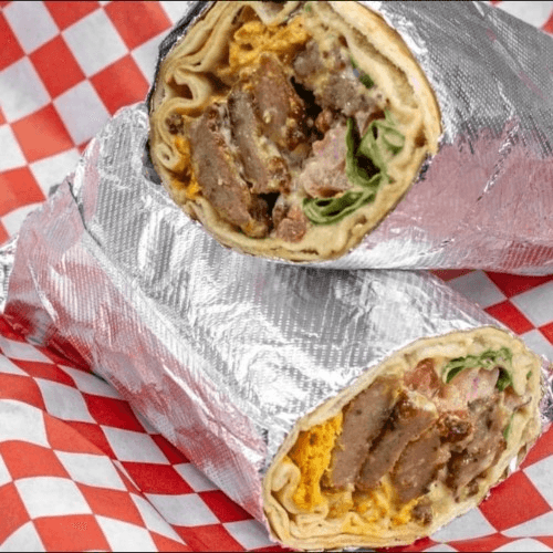 Gyro, mozzarella cheese, wrapped in white tortilla, served with garlic sauce, Queen sauce and hot sauce.
