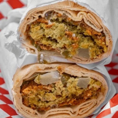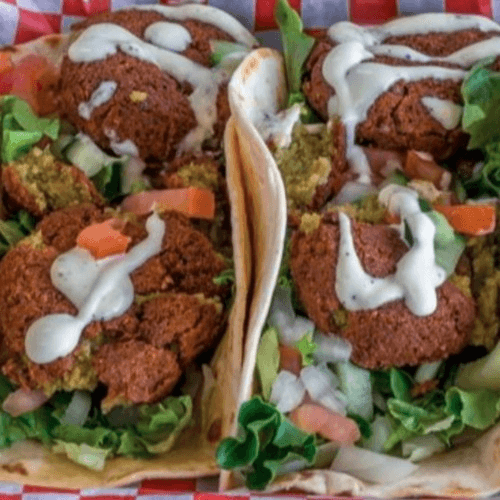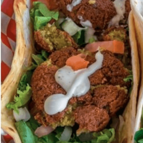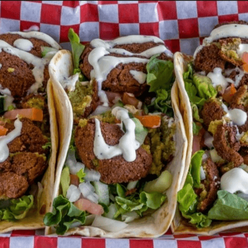 Crispy falafel balls, lettuce, tomato, cucumber, onion, Queen sauce, garlic sauce over tortillas.