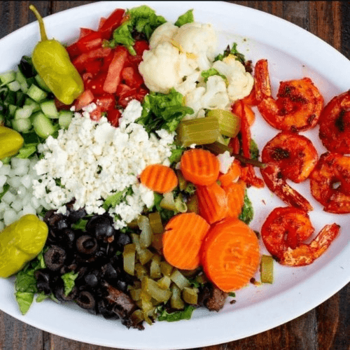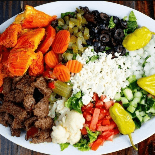 Your choice of protein, lettuce, tomato, cucumber, onion, crumbled feta cheese, black olives, giardiniera pickled veggies, side pita bread, Queen sauce and garlic sauce.