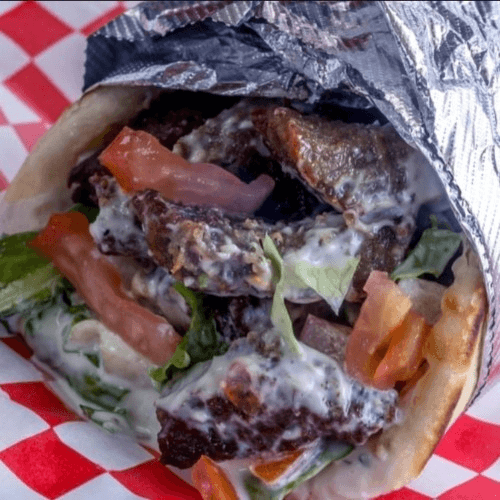 Marinated chicken, lettuce, tomato, cucumber, onion, Queen sauce, garlic sauce over toasted pita bread.