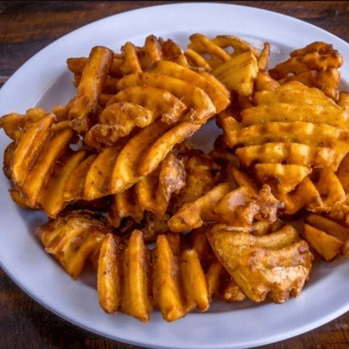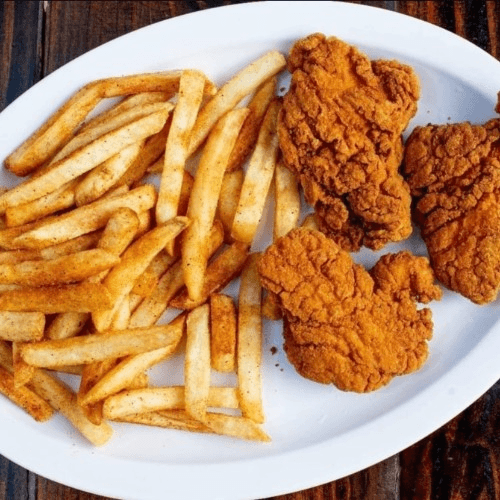 Crispy, golden-brown chicken tenders served with seasoned fries.