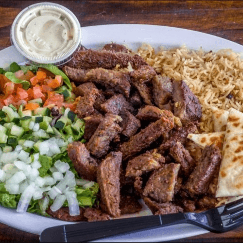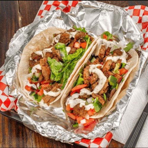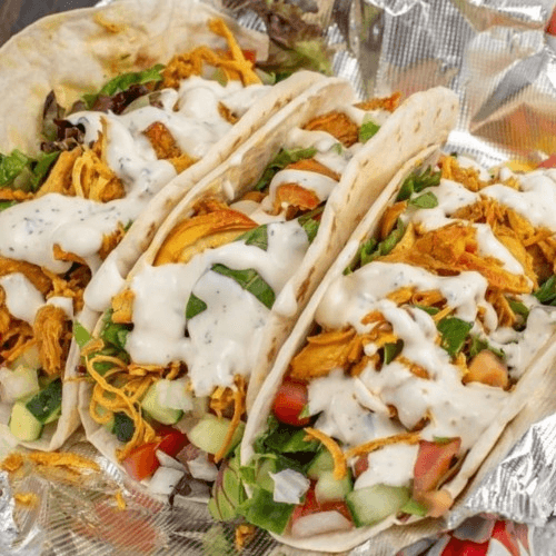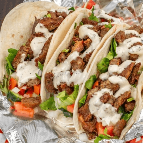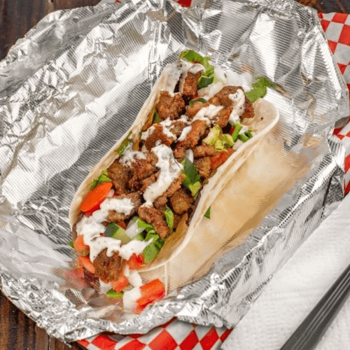 Your choice of protein, lettuce, tomato, cucumber, onion, Queen sauce, garlic sauce over toasted fajita tortillas.