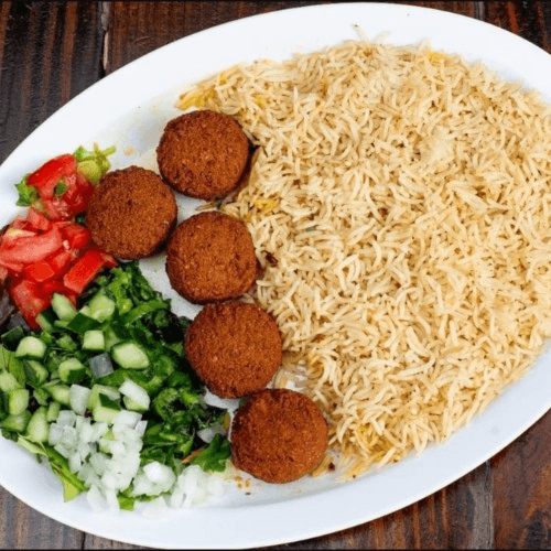 Crispy falafel over basmati rice with shredded lettuce, spring mix salad, diced tomato, cucumber, onion, side pita bread and sauces.