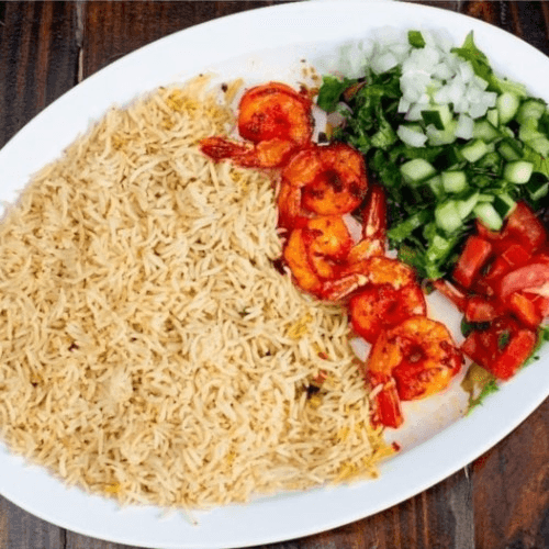 Marinated Shrimp over basmati rice with shredded lettuce, spring mix salad, diced tomato, cucumber, onion, side pita bread and sauces.
