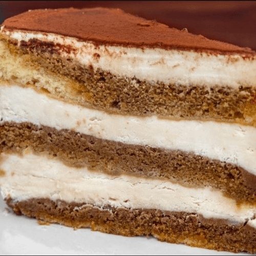 Layers of coffee-soaked sponge cake and mascarpone cream, topped with a dusting of cocoa powder.